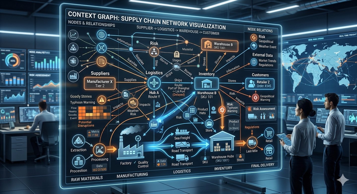 Supply chains operate blind when the current context and the history of decisions live outside your systems; capturing both field interactions and decision traces into a context graph turns reactive firefighting into predictive action.