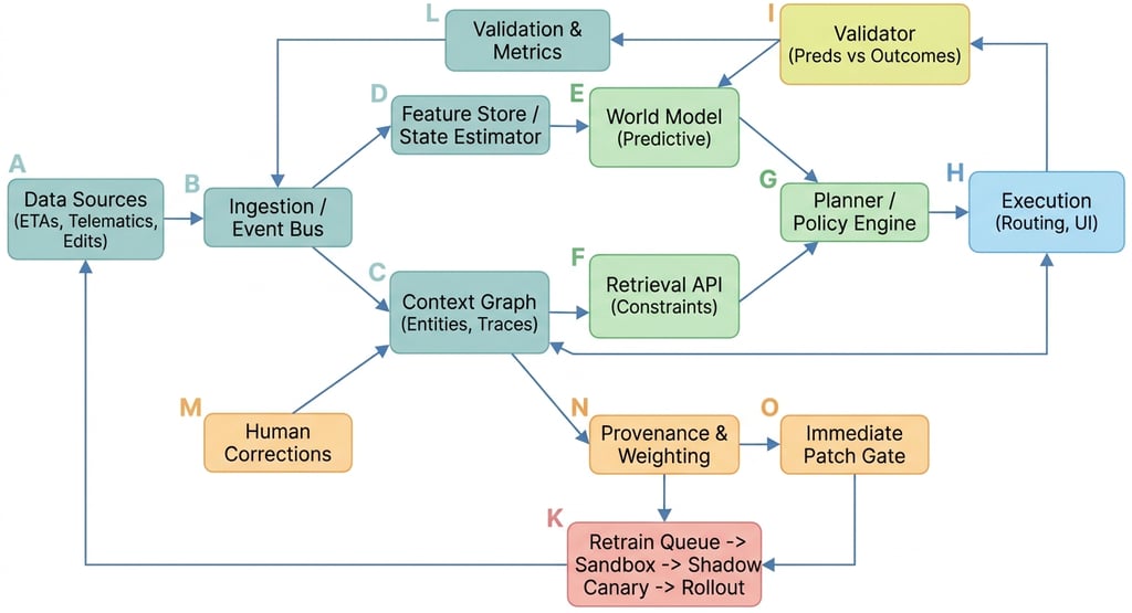 Provenance & Weighting tags human corrections by role and recency; high‑trust corrections can trigger immediate patches, others go to the retrain queue and follow sandbox → shadow → canary → rollout.